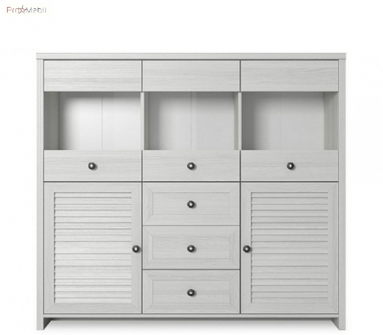 Буфет-витрина BAR 2D3W3S Инес ВМВ пятидверная с тремя выдвижными ящиками. За каждой дверью установлено по одной полке. Верхние двери оборудованы вставками из прозрачного стекла. Изготавливается из ламинированной ДСП. Используются петли Hettich.