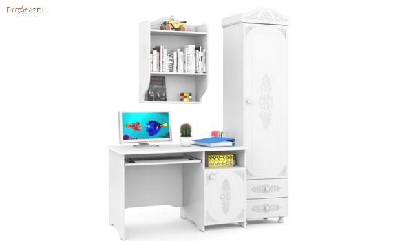 Комплект в детскую Белль Санти - изысканный набор мебели от украинского производителя «Санти-Мебель», для обустройства детской комнаты. Корпус изготавливается из ламинированной ДСП толщиной 16 мм немецкого концерна «Kronospan», фасад – из МДФ с технологией нанесения объемного рисунка 3D. Торцы деталей оклеиваются ПВХ-кромкой фирмы Rehau. Мебель Белль Санти выпускается в нежном цвете «белое дерево» со структурой дерева. Характерными особенностями мебели Белль Santi является изящный дизайн, объемные ажурные узоры на фасадах, декоративные карнизы интегрированные в корпус, фигурные ручки и ножки из натурального дерева, фирменные петли немецкого концерна Hettich и телескопические направляющие полного выдвижения. В детской комнате обязательно должна быть рабочая зона, в этом поможет детский гарнитур, в который входит: пенал для размещение одежды или белья, книг, учебных принадлежностей, стол письменный и навесной шкафчик. Мебель Белль Santi это способ уникальной аранжировки интерьера с уникальным, сказочно красивым дизайном. Купить мебель Белль Санти можно в нашем интернет-магазине ProMebli.ua с доставкой по всей Украине. Оплата за наличный и безналичный расчет, в кредит или рассрочку.