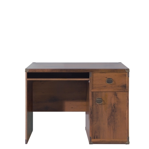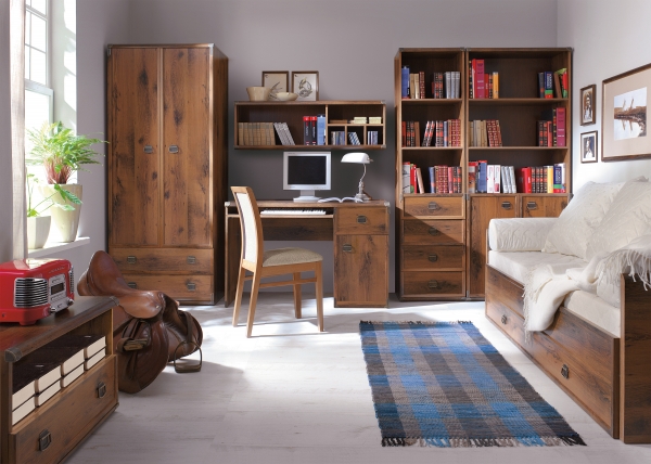 Детская стенка Индиана ВМК (БРВ) – современная и стильная в стиле дикого запада от фабрики БРВ Украина для детской. Мебель, вдохновленная приключенческими мотивами, привлекающая тех, кто остается в душе мечтателем о далеких странах. Все декоративные накладки фасадов, а также все днища и столешницы изготовлены из качественного МДФ, остальная же часть фасада и корпуса выполнены из ламинированного ДСП. Фасады украшают оригинальные металлические ручки в виде скоб и декоративные металлические закругленные накладки на верхних и нижних частях корпуса, тускло отблескивающие медью, которые выигрышно смотрятся в любом интерьере. Насыщенный цвет «дуб шуттер» и «сосна аризонская» завершают гармоничный образ. Используется немецкая фурнитура Hettich и роликовые направляющие полного выдвижения. В комплект для детской вошли: шкаф, письменный стол, два вида стеллажей и навесной шкафчик, которые позволят окунуться в мир приключений и странствий, в мир нераскрытых тайн. Купить мебель Индиана ВМК (БРВ) можно в нашем интернет-магазине ProMebli.ua с доставкой по всей Украине. Оплата за наличный и безналичный расчет, в кредит, рассрочку или оплату частями от ПриватБанк.