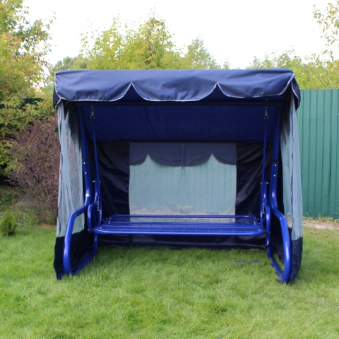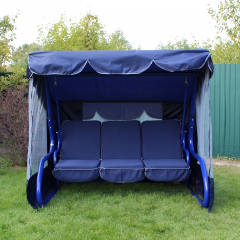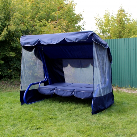 Качели садовые Лагуна 092 GreenGard - модель качели для отдыха в саду украинской фабрики GreenGard. Трехместные качели по типу качающаяся кровать в синем цвете подарят незабываемые минуты отдыха в компании родных и друзей. Главной особенностью модели являются наличие защитного тента, подлокотников, москитной сетки и возможность регулировать наклон спинки до лежачего положения. Так же дополнительно можно укомплектовать полочками для разных мелочей. Большего комфорта создает мягкий матрас из синтепона. Прочный материал каркаса и качественный водоотталкивающий текстиль обеспечивают надежность и долговечность в использовании, а так же простоту в уходе.