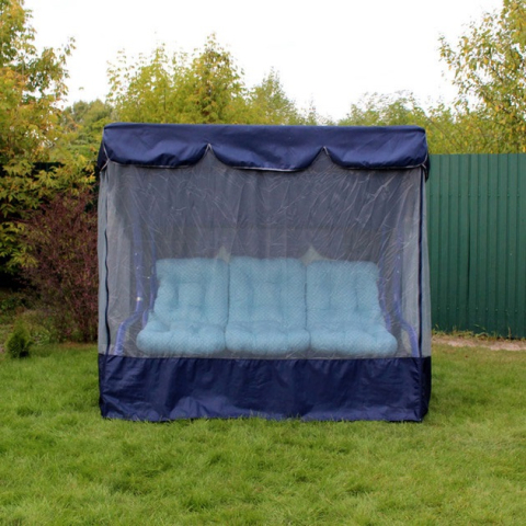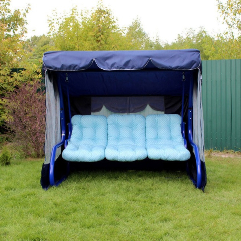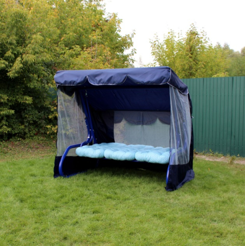 Качели садовые Лагуна 093 GreenGard - модель качели для отдыха в саду украинской фабрики GreenGard. Трехместные качели по типу качающаяся кровать в синем цвете подарят незабываемые минуты отдыха в компании родных и друзей. Главной особенностью модели являются наличие защитного тента, подлокотников, москитной сетки и возможность регулировать наклон спинки до лежачего положения. Так же дополнительно можно укомплектовать полочками для разных мелочей. Большего комфорта создает мягкий матрас из синтепона. Прочный материал каркаса и качественный водоотталкивающий текстиль обеспечивают надежность и долговечность в использовании, а так же простоту в уходе.
