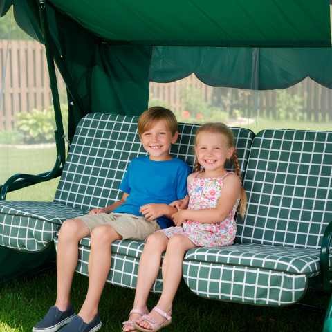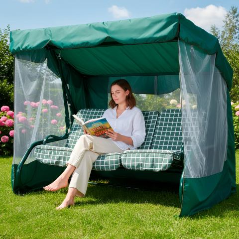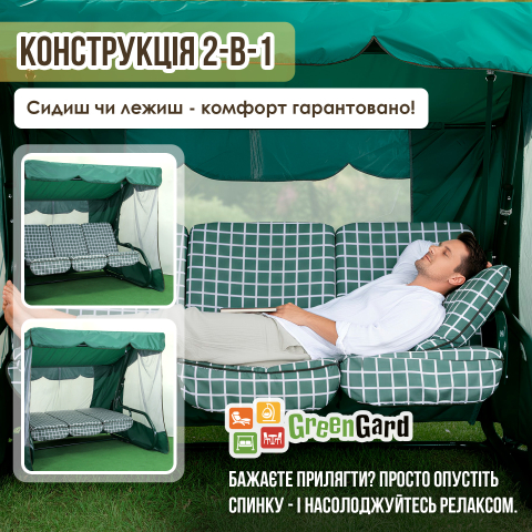 Садовые качели Мальта 014 GreenGard - уголок спокойствия прямо в саду, где время будто замедляется. Легкое покачивание, мягкие подушки и прохладная тень создают атмосферу отдыха, в которой хочется задержаться подольше. Здесь удобно устроиться с книгой, поговорить с близкими или просто вытянуться и наслаждаться свежим воздухом. Надежный каркас выполнен из стальной трубы диаметром 51 мм с прочным полимерным покрытием, которое защищает металл от влаги и сохраняет аккуратный внешний вид. Конструкция рассчитана на нагрузку до 350 кг, поэтому качели уверенно выдерживают отдых сразу трёх человек. Основание сиденья - сварная металлическая сетка, обеспечивающая прочность и устойчивость даже при активном использовании. Мягкие подушки толщиной 80 мм с наполнителем из поролона делают посадку особенно приятной. Чехлы из ткани бязь GOLD в зеленой клетке выглядят свежо и уютно, гармонично сочетаясь с зеленым каркасом и садовым окружением. Конструкция 2-в-1 позволяет легко изменить положение: сиденье можно быстро разложить в удобное место для отдыха лежа. В сложенном виде его размер составляет 170 × 56 см, а в разложенном - 170 × 115 см, создавая простор для комфортного расслабления. Тент из водоотталкивающей ткани Oxford защищает от солнца и легкого дождя, а благодаря регулировке угла наклона легко подстроить тень под положение солнца. Дополнительный комфорт обеспечивает антимоскитная сетка, позволяя спокойно отдыхать даже в вечернее время. Габариты качелей 212 × 160 × 178 см создают просторное место отдыха, которое при этом аккуратно вписывается в садовое пространство. GreenGard Malta 014 - место, где каждый летний день превращается в маленький отпуск.