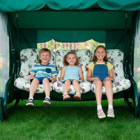 Качели садовые Таити 022 создают особое настроение отдыха, где каждый момент на свежем воздухе наполняется спокойствием и легкостью. Глубокий зеленый оттенок перекликается с цветом листвы и травы, благодаря чему качели естественно вписываются в садовое пространство и выглядят как гармоничная часть природы. Здесь приятно остановиться после активного дня, почувствовать мягкое покачивание и просто насладиться тишиной, ароматами сада и свежим воздухом. Просторная конструкция рассчитана на комфортный отдых для трех человек, а прочный каркас выдерживает нагрузку до 400 кг, поэтому на качелях удобно разместиться всей семьей или небольшой компанией. Основа конструкции выполнена из стальной трубы диаметром 60 мм и толщиной 1,5 мм с защитным полимерным покрытием, которое помогает сохранять аккуратный внешний вид и повышает устойчивость к внешним условиям. Сиденье шириной 1700 мм обеспечивает достаточно пространства для отдыха. В сложенном положении его размеры составляют 1700 × 560 мм, а при опущенной спинке оно превращается в удобную поверхность 1700 × 1150 мм, позволяя выбрать более расслабленную позицию. Основание сиденья выполнено из сварной металлической сетки, что делает конструкцию прочной и надежной. Мягкость создают три отдельные подушки с наполнителем из холлофайбера - легкого и гипоаллергенного материала, который хорошо держит форму и остается комфортным в использовании. Чехлы из ткани бязь GOLD украшены нежным рисунком цветов и бабочек, добавляя садовым качелям лёгкий декоративный акцент и ощущение летней свежести. Тент из водоотталкивающей ткани Oxford защищает от солнца и легкой непогоды, создавая приятную тень. Его можно регулировать по наклону, подстраивая уровень защиты от солнца в течение дня. Дополнительный комфорт обеспечивает антимоскитная сетка, которая помогает спокойно отдыхать даже вечером, не отвлекаясь на насекомых. Габариты качелей 2120 × 1600 × 1780 мм создают просторное место для отдыха, где можно расслабиться, пообщаться или просто провести время на природе. Таити 022 - место, где сад становится уютным пространством для отдыха и спокойных летних мгновений.