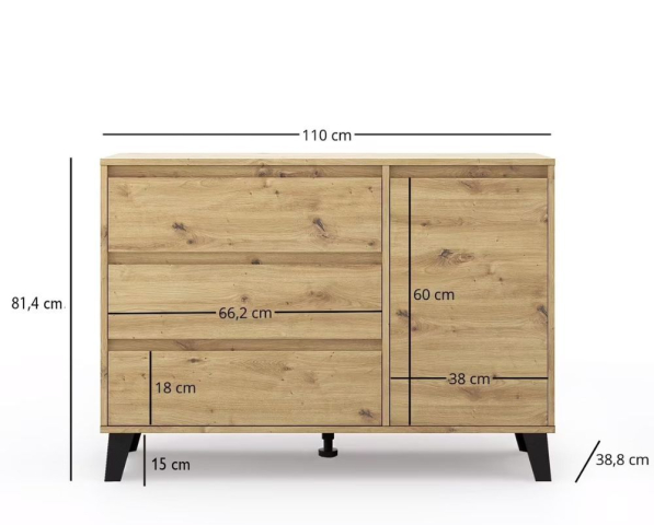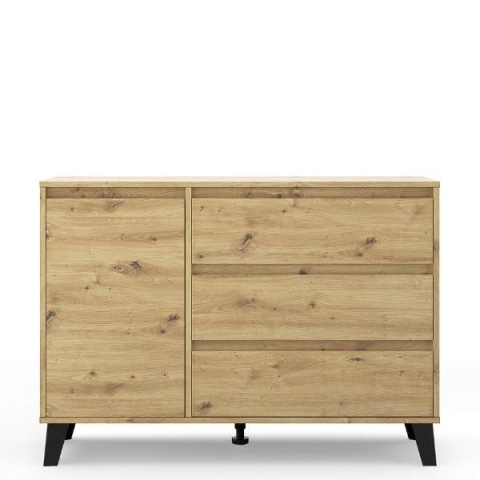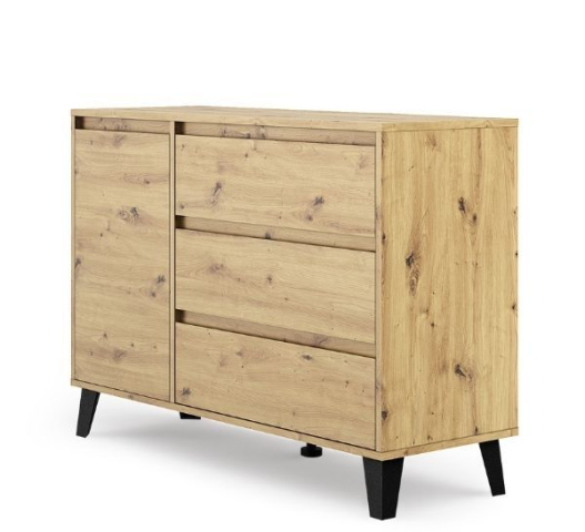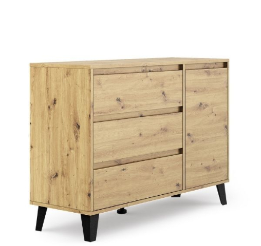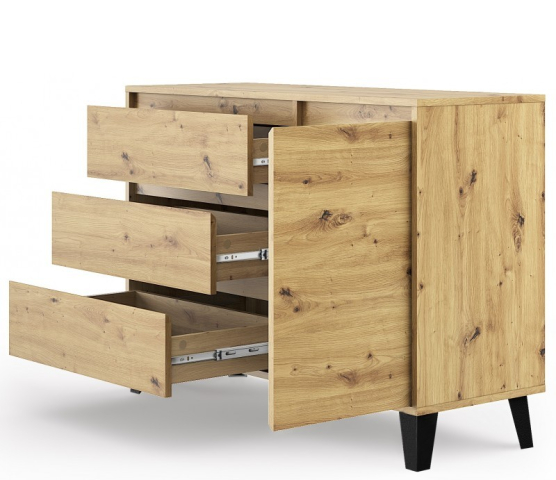 Комод 1D3S Borg дуб артизан Mebel Bos — выразительный и стильный, создан с учетом Ваших потребностей, ритма жизни и индивидуального вкуса, чтобы гармонично вписаться в уютную гостиную, спокойную спальню или яркую детскую комнату, придавая пространству особый акцент, наполняя его теплом, практичной элегантностью и атмосферой продуманного комфорта. Комод содержит закрытое отделение с полочкой внутри и три выдвижных ящика, обеспечивая удобное хранение как для габаритных вещей, так и для мелочей, которые всегда хочется держать под рукой. Корпус и фасадные элементы изготовлены из прочного ламинированного ДСП толщиной 16 мм, в теплом оттенке дуб артизан. Особое внимание уделено деталям: четкие геометрические формы подчеркивают характер комода и его современное звучание, отсутствие ручек компенсируется изящными фрезерованными выемками, которые добавляют фасадам оригинальности и чистоты линий, высокие, изящные ножки придают визуальную легкость, словно комод парит над полом, одновременно сохраняя высокую устойчивость, а качественная фурнитура, обеспечивает мягкость и плавность в использовании. Borg Mebel Bos — мебель с характером, создающая завершенный образ помещения, наполняющая пространство уютом, ощущением порядка и вдохновения, становясь неотъемлемой частью вашего дома и отражая ваше стремление к стилю, функциональности и эстетике в каждой детали.