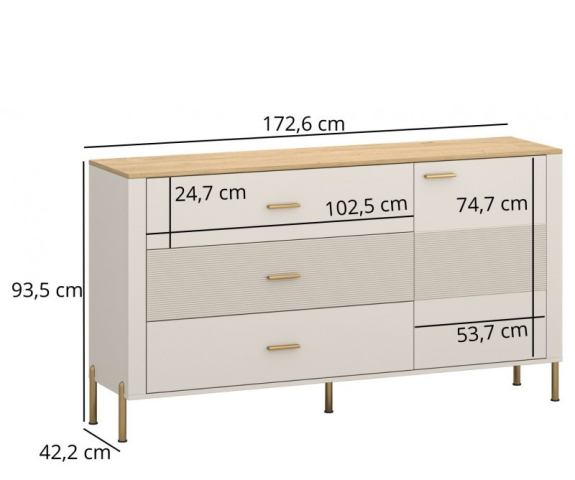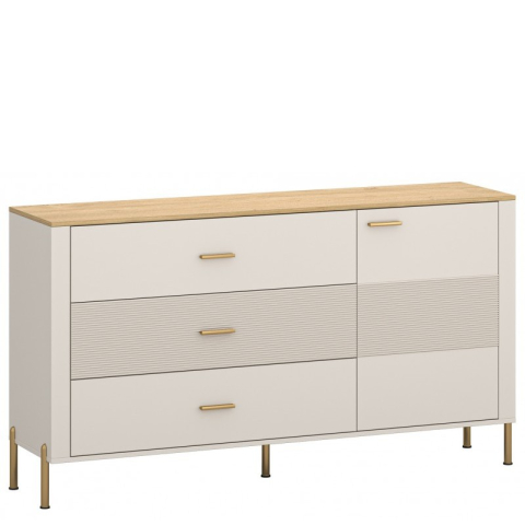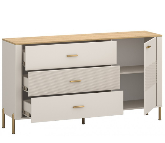 Комод 1D3S Ruben Mebel Bos - симфония утонченного стиля, роскоши и комфорта, которая придаст гостиной, спальне, столовой, рабочему кабинету элегантность и гармонию, превращая интерьер в пространство мечты. Элегантный комод содержит закрытое отделение с полочкой внутри и три выдвижных ящика, обеспечивая удобное хранение вещей. Коллекция завораживает с первого взгляда воплощением эстетики и стиля: теплый оттенок «кашемир» наполняет пространство ощущением спокойствия и умиротворения, превращая интерьер в оазис уюта, столешницы в оттенке «дуб каменный» эффектно выделяются на светлом фоне, создавая выразительный акцент и подчеркивая стильную подачу декора; утонченные рифленые декоративные элементы, придают поверхностям объем и глубину, играя с тенями и светом; роскошные золотистые ручки станут элегантным украшением, подчеркивающим благородный стиль коллекции; легкие и изящные ножки золотого цвета придают конструкции воздушность, сохраняя при этом непревзойденную устойчивость и надежность, а высококачественная фурнитура обеспечивает плавность и бесшумность работы, даря удовольствие от каждого прикосновения. Ruben Mebel Bos настоящее произведение искусства, создающее пространство, в котором каждая деталь вдохновляет, а комфорт становится искусством!