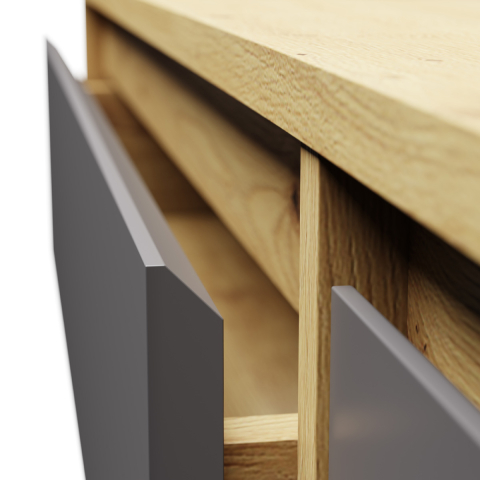 Комод 1Д3Ш Нитро Софт Сокме - современный предмет мебели, идеально подходящий для хранения вещей в спальни, гостиной, детской и прихожей. Комод состоит из одной распашной дверцы, внутри которая скрывает две полки и трех выдвижных ящиков. Коллекция выгодно выделяется: стильным современным дизайном; правильными геометрическими формами; гармонией темных фасадов и натуральной древесной текстуры; отсутствием ручек, их роль выполняют фрезерованные на фасаде выемки под углом 45°; небольшими устойчивыми ножками; а также качественной фурнитурой. Мебель Нитро Софт графит Сокме - функциональное решение для современных интерьеров, которое сочетает эстетику и удобство, создавая уютное и практичное пространство.