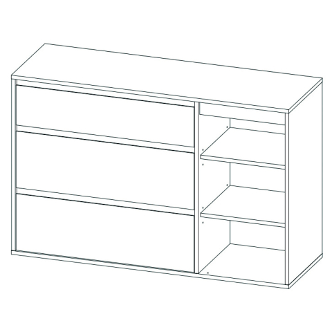 комод содержит три выдвижных ящика и одно закрытое отделение с полочками внутри |