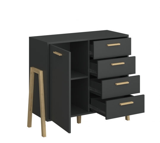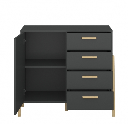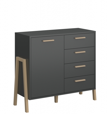 Комод 1D4S Бель антрацит ВМВ представляет собой удивительное сочетание изысканного вкуса, стиля и элегантности, которая обязательно покорит даже самых взыскательных клиентов и легко создаст модное и функциональное пространство в гостиной. Комод содержит четыре выдвижных ящика и одно закрытое отделение с полкой внутри. Мебель привлекает внимание своим неординарным дизайном и интересной формой; необычной ассиметричной композицией; классическим антрацитовым оттенком; удлиненными удобными ручками и высокими выступающими по бокам ножками, изготовленными из натурального дерева; фирменными комплектующими. Коллекция Belle VMV порадует всех любителей инновационных идей, а также современных, оригинальных и элегантных интерьеров, тех, кто ценит роскошь и комфорт в своем доме.