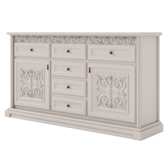 Комод 2Д 1.8 Лацио Світ Меблів — истинное воплощение дворцовой роскоши и винтажного стиля, который добавляет элегантности и утонченности в ваш интерьер. Комод включает два закрытых отделения с полочками внутри каждого, обеспечивая удобное место для хранения различных предметов и шесть выдвижных ящиков, скрывающих ваши вещи от посторонних глаз, делают модель особенно практичной и удобной для использования. Корпус из ламинированного ДСП, а фасады с резными элементами из МДФ, в элегантном оттенке "сатин", который сочетает в себе мягкость светлых тонов и благородную сдержанность, наполняя пространство легкостью, воздушностью и аристократической элегантностью, создавая утонченное обрамление для интерьера, подчеркивая стиль и гармонию в каждом элементе. Детали, металлические ручки в латунном исполнении и стеклянные вставки с фацетом, подчеркивают неповторимый стиль и шарм. Комод 2Д 1.8 Лацио станет не только практичным элементом вашего интерьера, но и стильным акцентом, создающим атмосферу комфорта и роскоши в вашем доме.