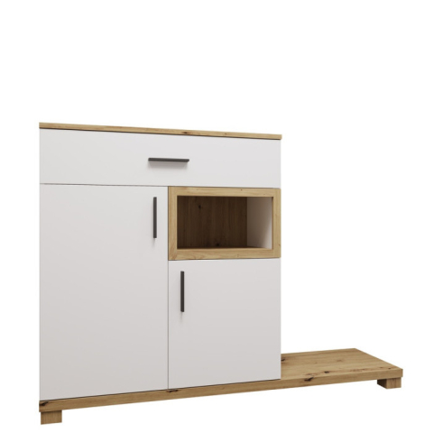 комод содержит один выдвижной ящик, два закрытых отделения с полочками внутри, открытую нишу открытую полку для обуви |