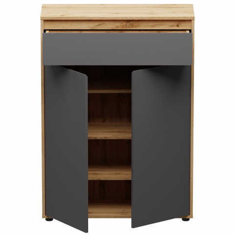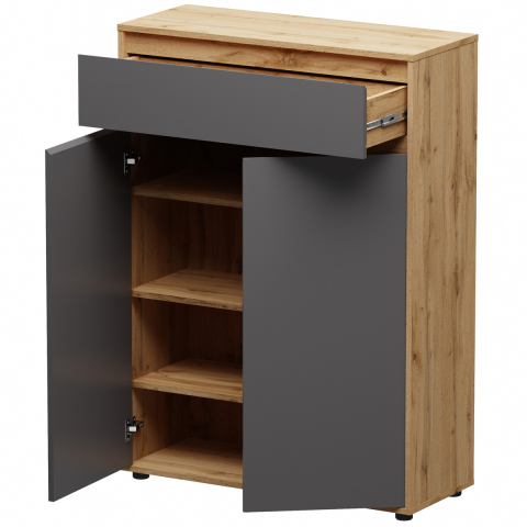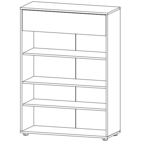 комод содержит один выдвижной ящик и одно закрытое отделение с тремя полками внутри |