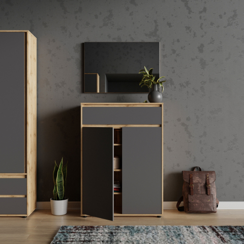Комод 2Д1Ш Нитро Софт Сокме - современный предмет мебели, идеально подходящий для хранения вещей в спальни, гостиной, детской и прихожей. Комод состоит из одного выдвижного ящика и одного закрытого отделения с тремя полками внутри. Коллекция выгодно выделяется: стильным современным дизайном; правильными геометрическими формами; гармонией темных фасадов и натуральной древесной текстуры; отсутствием ручек, их роль выполняют фрезерованные на фасаде выемки под углом 45°; небольшими устойчивыми ножками; а также качественной фурнитурой. Мебель Нитро Софт графит Сокме - функциональное решение для современных интерьеров, которое сочетает эстетику и удобство, создавая уютное и практичное пространство.