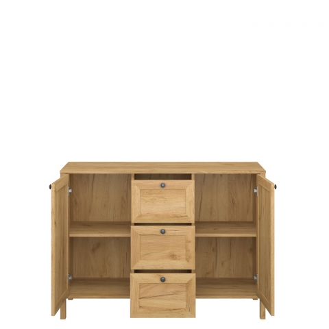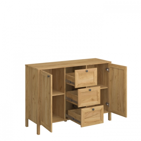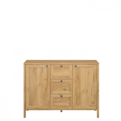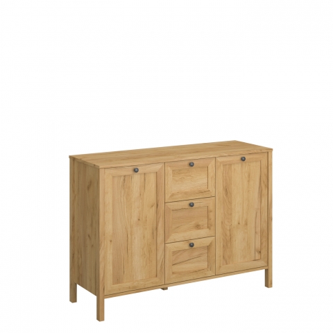 Комод 2D3S Кларк Кларк - сочетание стиля модерн с нотками кантри, от украинской мебельной фабрики VMV Holding для обустройства гостиной, а также его можно разместить в столовой, рабочем кабинете или даже в офисе. Комод содержит три выдвижных ящика и два закрытых отделения с полкой в каждом. Корпус изготавливается из высококачественного ламинированного ДСП Kronospan толщиной 16 мм, фасадные части из ламинированного ДСП Kronospan толщиной 16 мм с элементами МДФ в приятном древесном оттенке дуб крафт золотой. Уникальности комоду придают безупречная эстетика; естественная теплота древесного оттенка; небольшие темные ручки круглой формы; рамочные фасады; выразительные массивные боковые планки, плавно переходящие в высокие ножки; фирменные комплектующие. Благодаря мебели Klark VMV Вы создадите в интерьере уютную атмосферу и по-домашнему семейное тепло.