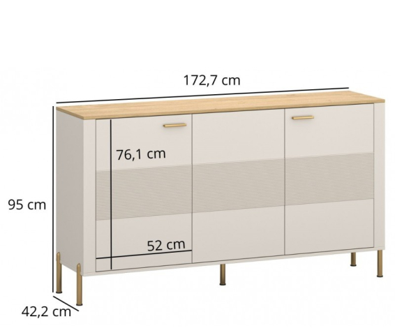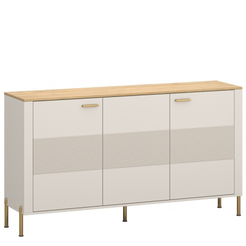 Комод 3D Ruben Mebel Bos - симфония утонченного стиля, роскоши и комфорта, которая придаст гостиной, спальне, столовой, рабочему кабинету элегантность и гармонию, превращая интерьер в пространство мечты. Элегантный комод содержит два закрытых отделения с полочкой внутри каждого, обеспечивая удобное хранение вещей и поддержание порядка. Коллекция завораживает с первого взгляда воплощением эстетики и стиля: теплый оттенок «кашемир» наполняет пространство ощущением спокойствия и умиротворения, превращая интерьер в оазис уюта, столешницы в оттенке «дуб каменный» эффектно выделяются на светлом фоне, создавая выразительный акцент и подчеркивая стильную подачу декора; утонченные рифленые декоративные элементы, придают поверхностям объем и глубину, играя с тенями и светом; роскошные золотистые ручки станут элегантным украшением, подчеркивающим благородный стиль коллекции; легкие и изящные ножки золотого цвета придают конструкции воздушность, сохраняя при этом непревзойденную устойчивость и надежность, а высококачественная фурнитура обеспечивает плавность и бесшумность работы, даря удовольствие от каждого прикосновения. Ruben Mebel Bos настоящее произведение искусства, создающее пространство, в котором каждая деталь вдохновляет, а комфорт становится искусством!
