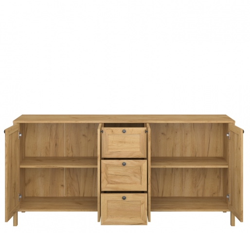 комод содержит три выдвижных ящика и два закрытых отделения с полкой в каждом |