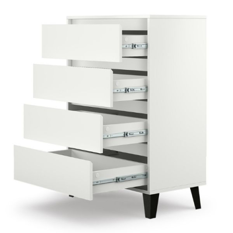 Комод 4S/70 Borg белый Mebel Bos — выразительный и стильный, создан с учетом Ваших потребностей, ритма жизни и индивидуального вкуса, чтобы гармонично вписаться в уютную гостиную, спокойную спальню или яркую детскую комнату, придавая пространству особый акцент, наполняя его теплом, практичной элегантностью и атмосферой продуманного комфорта. Комод содержит четыре выдвижных ящика, обеспечивая удобное хранение повседневных вещей и помогая поддерживать порядок в интерьере. Корпус и фасадные элементы изготовлены из прочного ламинированного ДСП толщиной 16 мм, в ослепительном белоснежном оттенке. Особое внимание уделено деталям: четкие геометрические формы подчеркивают характер комода и его современное звучание, отсутствие ручек компенсируется изящными фрезерованными выемками, которые добавляют фасадам оригинальности и чистоты линий, высокие, изящные ножки придают визуальную легкость, словно комод парит над полом, одновременно сохраняя высокую устойчивость, а качественная фурнитура, обеспечивает мягкость и плавность в использовании. Borg Mebel Bos — мебель с характером, создающая завершенный образ помещения, наполняющая пространство уютом, ощущением порядка и вдохновения, становясь неотъемлемой частью вашего дома и отражая ваше стремление к стилю, функциональности и эстетике в каждой детали.