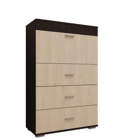 Практичный и вместительный комод 800 Марк Сокме удачно совмещает в себе функциональность и необычный смелый дизайн и предназначена для обустройства изысканной гостиной, столовой и спальни. Комод подходит для хранения любых вещей и включает в себя одно закрытое отделение с откидной дверцей и три выдвижных ящика. Корпус и фасадные части изготовлены из качественного ламинированного ДСП толщиной 16 мм с декоративными рифлеными вставками из МДФ, в интересном сочетании цветов венге магия и дуб родос. Торцевые поверхности всех внутренних и наружных элементов изделий облицованы кромкой ABS толщиной 0,5 мм, придавая мебели завершенный красивый и ухоженный вид. Комод привлекает внимание элегантным минималистическим стилем; сочетанием двух оттенков; прямыми четкими линиями; продолговатыми пластиковыми ручками; пластиковыми ножками; фирменными комплектующими: телескопическими направляющими и петлями без доводчика, которые обеспечивают максимальный комфорт в использовании. Мебель Марк Сокме практичная, эргономичная, легкая порадует поклонников минимализма и современного стиля.