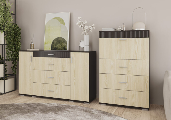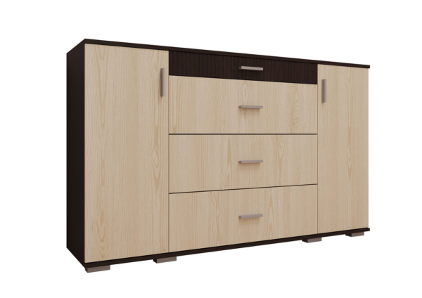 Практичный и вместительный комод 1500 Марк Сокме удачно совмещает в себе функциональность и необычный смелый дизайн и предназначена для обустройства изысканной гостиной, столовой и спальни. Комод подходит для хранения любых вещей и включает в себя два закрытых отделения с полочками внутри и четыре выдвижных ящика. Корпус и фасадные части изготовлены из качественного ламинированного ДСП толщиной 16 мм с декоративными рифлеными вставками из МДФ, в интересном сочетании цветов венге магия и дуб родос. Торцевые поверхности всех внутренних и наружных элементов изделий облицованы кромкой ABS толщиной 0,5 мм, придавая мебели завершенный красивый и ухоженный вид. Комод привлекает внимание элегантным минималистическим стилем; сочетанием двух оттенков; прямыми четкими линиями; продолговатыми пластиковыми ручками; пластиковыми ножками; фирменными комплектующими: телескопическими направляющими и петлями без доводчика, которые обеспечивают максимальный комфорт в использовании. Мебель Марк Сокме практичная, эргономичная, легкая порадует поклонников минимализма и современного стиля.