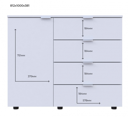 комод содержит четыре выдвижных ящика и одно закрытое отделение |