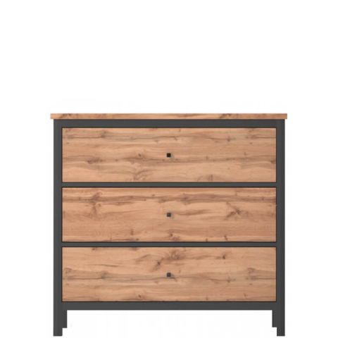 Эффектный комод KOM3S Чос Gerbor прекрасно дополнит интерьер гостиной либо спальни и поможет в хранении различных вещей и одежды. Комод содержит три выдвижных ящика. Главными особенностями коллекции являются: строгая геометрия форм; деревянные оттенки и текстуры в эффектных цветовых решениях: дуб тахо / черный; стильные точечные миниатюрные пластиковые ручки; утолщенные рамки фасадов, плавно перетекающие в стойкие высокие ножки; фирменные комплектующие: роликовые направляющие GAMET – Польша. Мебель Чос Gerbor поможет в рациональном использовании жизненного пространства и позволит достичь уютного окружения в доме и правильно расставить все вещи на свои места.