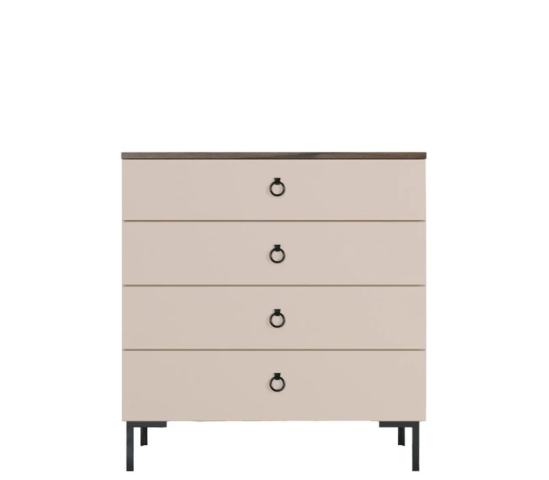 Комод KOM4S Симпл макадамия ВМК (БРВ) — энергичный и выразительный, с урбанистическим характером, созданный специально для обустройства подростковой комнаты, чтобы пространство отражало индивидуальность, стиль и внутреннюю свободу, сочетая высокую функциональность и визуальную легкость с атмосферой, в которой приятно не только учиться и отдыхать, но и мечтать, творить, быть собой. Комод содержит четыре выдвижных ящика, которые идеально подойдут для хранения одежды, школьных принадлежностей, любимых вещей и личных мелочей, без которых не обходится ни один подростковый день. Комод привлекает внимание с первого взгляда – своим стильным индустриальным обликом; выразительными линиями; лаконичными формами и точной геометрией; цветовым тандемом, который поражает своей выразительностью: глубокий оттенок макадамия гармонично сочетается с насыщенным древесным рисунком дуба ливорно, наполняя интерьер ощущением тепла, уверенности и уюта; трендовыми черными ручками-кольцами, добавляющими брутальной графичности; высоким основанием на металлических ножках, визуально облегчающим конструкцию; надежной фурнитурой. Симпл ВМК (БРВ) – эффектное решение для тех, кто устал от скучных решений и хочет превратить комнату в яркое, живое и по-настоящему личное пространство.