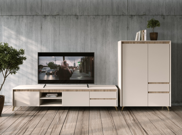 Комод REG1D5S1K Лаундж кашемир ВМК (БРВ) - восхитительное воплощение современного минимализма и утонченного стиля, где каждый элемент создан с безупречным вкусом, продуман до мелочей и наполнен благородной эстетикой, дарящей гостиной непередаваемое ощущение гармонии, легкости и очарования натуральных оттенков. Комод содержит пять выдвижных ящиков и два закрытых отделения: за верхней дверцей установлены две полки, в нижней части за откидной дверью находится просторное отделение, разделенное вертикальной перегородкой на две части. Комод привлекает внимание воплощением сдержанной элегантности, в которой каждая деталь продумана до совершенства; вертикальными декоративными вставками с тонкой древесной текстурой, элегантно интегрированной в фасады, добавляя глубины и ритма в композицию; полностью отсутствуют ручки, заменены элегантными фрезерованными выемками, что придает фасадам особую выразительность и утонченность форм; высокими наклонными ножками из прочного пластика, которые придают конструкции легкость, акцентируя ее современные линии, при этом обеспечивая отличную устойчивость; качественной фурнитурой, которая обеспечивает мягкость и плавность в использовании. Лаундж кашемир ВМК (БРВ) — основа для создания изысканного, стильного и гармоничного интерьера, в котором каждый элемент наполнен смыслом, а каждая деталь работает на атмосферу легкости, уюта и утонченного вкуса.