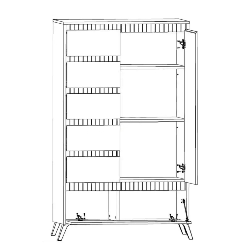 комод содержит пять выдвижных ящиков и два закрытых отделения: за верхней дверцей установлены две полки, в нижней части за откидной дверью находится просторное отделение, разделенное вертикальной перегородкой на две части |
