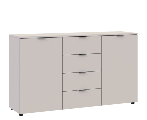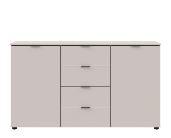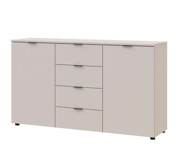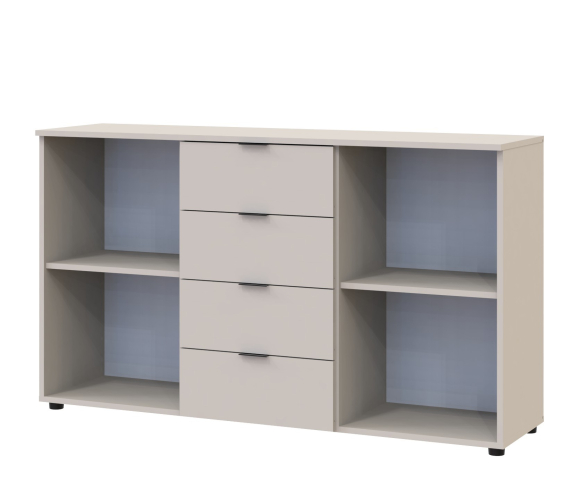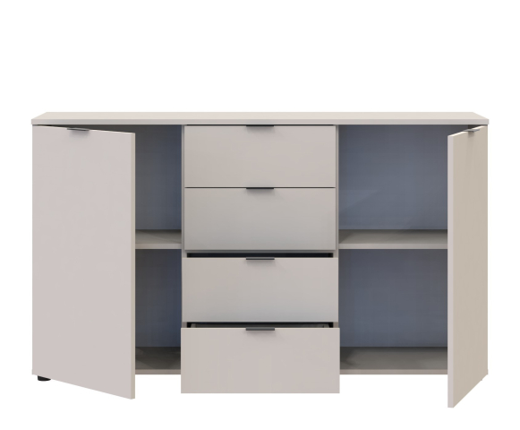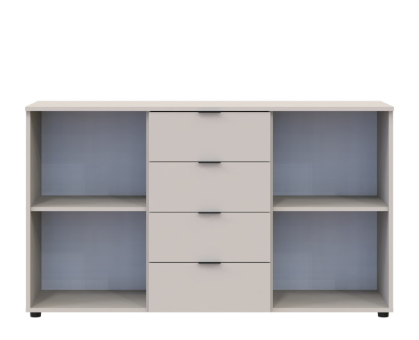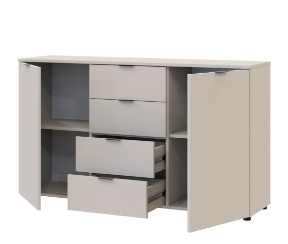 комод содержит четыре выдвижных ящика и два закрытых отделения полками внутри |