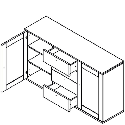 комод содержит четыре выдвижных ящика и два закрытых отделения с двумя полками внутри каждого |