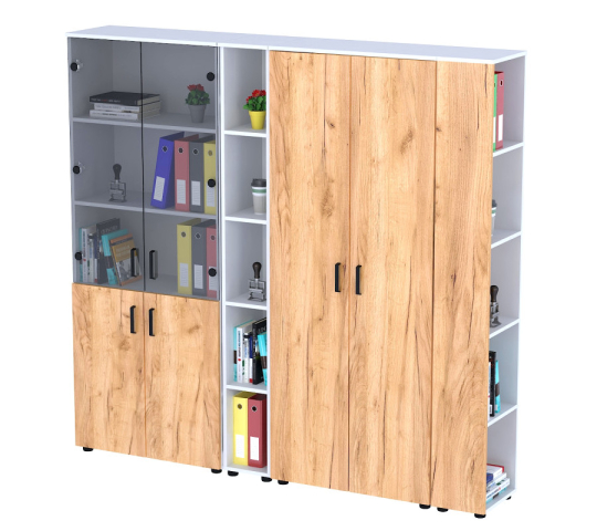 Ищете способ превратить рабочее пространство в аккуратное, стильное и вдохновляющее место? Комплект шкафов Open Office №5 Loft Design создан именно для этого! Универсальная система хранения помогает легко организовать документы, книги и все важные мелочи, наполняя кабинет ощущением порядка и гармонии. Благодаря продуманной конструкции шкаф сочетает открытые полки для быстрого доступа к папкам и декору, закрытые секции с деревянными дверцами для надежного хранения личных вещей, а также элегантные отделения со стеклянными фасадами, которые защищают содержимое от пыли и придают всему ансамблю современный характер. Прочный каркас выдерживает внушительные нагрузки, а регулируемые ножки позволяют уверенно разместить шкаф даже на неровной поверхности, исключая шатание и защищая пол. Износостойкие ЛДСП материалы гарантируют долговечность, а лаконичный дизайн с легкостью впишется в любой интерьер — от строгого офисного до уютного домашнего кабинета. Open Office №5 Loft Design — не просто шкаф, а продуманное решение для тех, кто ценит порядок, комфорт и безупречный стиль каждый день!