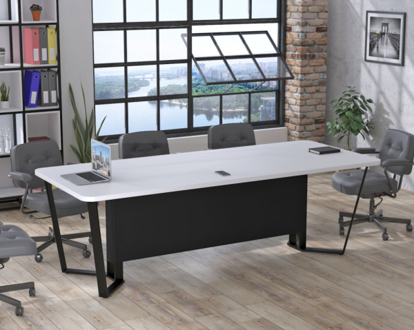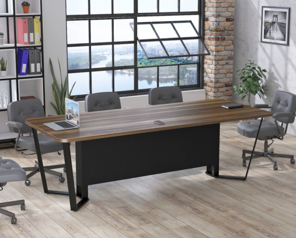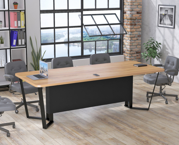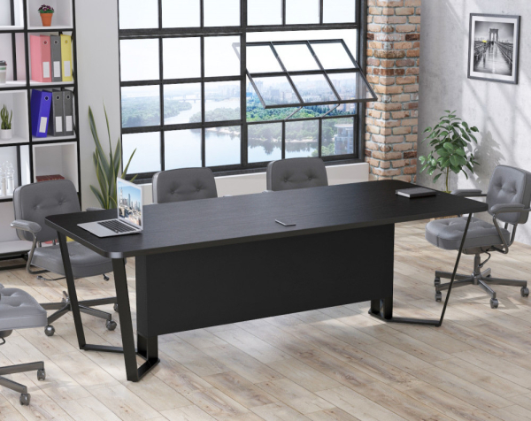 Стол для переговоров V-240 от компании Loft Design- это современное виденье офисной мебели. Теперь стол для переговоров может быть не просто большим и скучным, а стильным и привлекающим к себе особое внимание. Он выполнен в стиле лофт и модерн, который популярен и актуален на протяжении долгого времени. Такой современный стол станет центральной фигурой любого конференц-зала. Конструкция стола состоит из опор, соединенных перегородкой из ДСП снизу и столешницы. Опоры изготовлены из металлических труб 60х15 мм. Перегородка и опоры стола спроектированы таким образом, чтобы каждый комфортно чувствовал себя сидя за столом. Все металлические элементы окрашены в черный цвет, методом порошкового напыления. Благодаря такому покрытию поверхность металла выглядит более эстетично и имеет длительный срок службы. В основании установлены регулируемые ножки. Они позволят компенсировать все неровности поверхности, а также защитят от возникновения царапин и потертостей на поверхности пола. Столешница изготовлена из прочного и качественного ЛДСП толщиной 36 мм. Цветовая гамма довольно обширная, что позволит подобрать расцветку под ваш интерьер. Стол для переговоров V-240– это солидный представитель своей категории. Он вместительный, что позволяет легко и комфортно расположить до восьми человек. Стол прекрасно подойдет не только для конференц-залов, а и для оформления учительской в школе или университете, рабочих хабов, общего места работы и отдыха в хостеле.