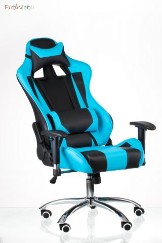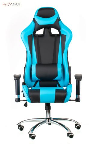 геймерское кресло голубо-черного цвета с поясничным валиком и подушкой-подголовником, обе подушки имеют анатомическую форму и крепятся при помощи специальных ремешков |