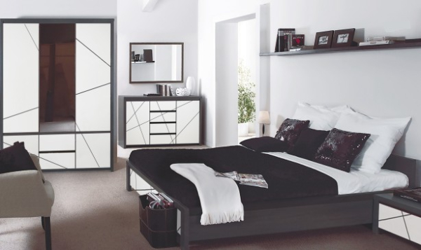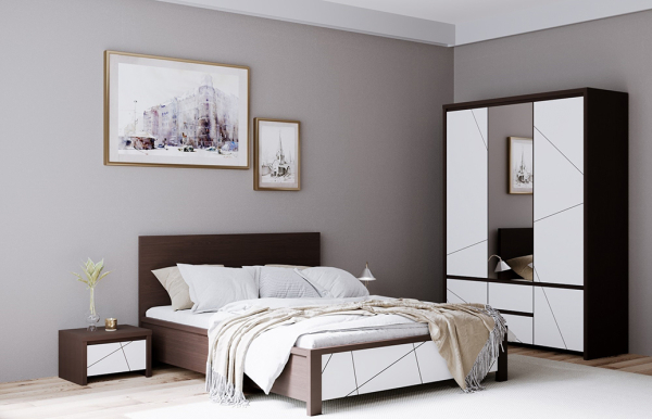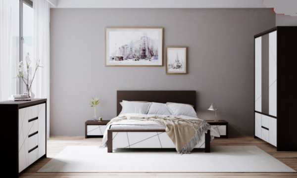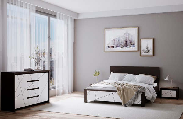 Кровать LOZ/90 Каспиан белый снег с нестандартной коллекции от фабрики БРВ Украина для обустройства спальни. Односпальная кровать 90х200 см с практичным изголовьем и металлическим каркасом с ортопедическими ламелями. Матрас покупается отдельно. Каркас изготовлен из качественного ламинированного ДСП, фасадные части изготовлены из качественного ламинированного МДФ в необычном сочетании выразительного темного корпуса в цвете «дуб милано темный» с белоснежными фасадами цвета «белый снег». Кровать привлекает внимание уникальным и инновационным дизайном; эффектным внешним видом; геометрическим оригинальным фрезерованным узором, создавая оригинальный эффект. Мебель Каспиан ВМК (БРВ) добавит вашему интерьеру элегантности и шика, с дуновением современности.