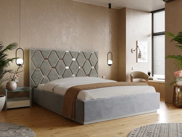 На выбор предоставлены 9 вариантов цветов окраски дерева с различными вариантами исполнения обивки, а также на кровати присутствует зеркальный пластик золотого или серебряного цвета по выбору: