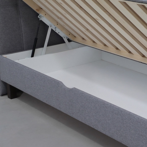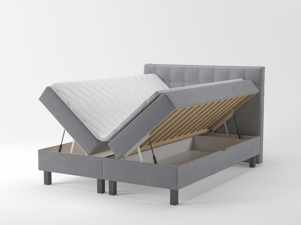 мягкая кровать оснащена боковым подъемным механизмом с коробом для белья и мягким стеганым изголовьем |