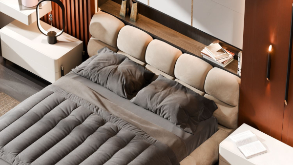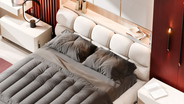 мягкая кровать оснащена подъемным механизмом и мягким изголовьем |