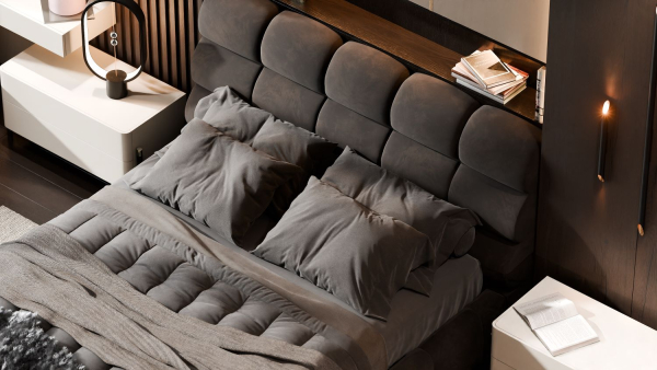 мягкая кровать оснащена подъемным механизмом и мягким изголовьем |