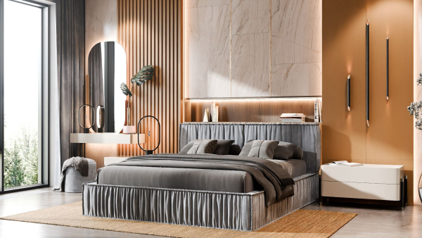 Окунитесь в мир нежного уюта и современного стиля с кроватью Ванесса 3 Світ Меблів, которая сочетает современный дизайн, роскошь и практичность. Полуторная кровать с размером спального места 140x200 см станет центральным элементом вашей спальни, создавая атмосферу уюта и изысканности. Каркас изготовлен из прочного ламинированного ДСП толщиной 16 мм, что гарантирует надёжность и долговечность, а обивка из нежного велюра дарит тактильное удовольствие и визуальную элегантность. Мягкий корпус и эффектное изголовье с пышной сборкой добавляют интерьеру нотки утончённости и шарма. Широкая палитра цветов позволяет выбрать подходящий оттенок для вашего интерьера. Кровать оснащена подъёмным механизмом с прочным металлическим каркасом и буковыми ламелями, который не только обеспечивает надежную поддержку матраса, но и открывает просторное место для хранения постельных принадлежностей. Кровать Ванесса 3 — это стильное и практичное решение, которое превращает вашу спальню в оазис уюта, где каждый день наполняется гармонией и наслаждением.