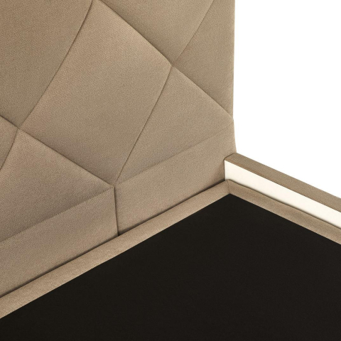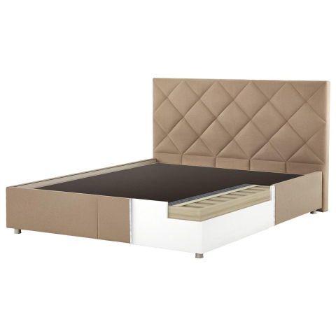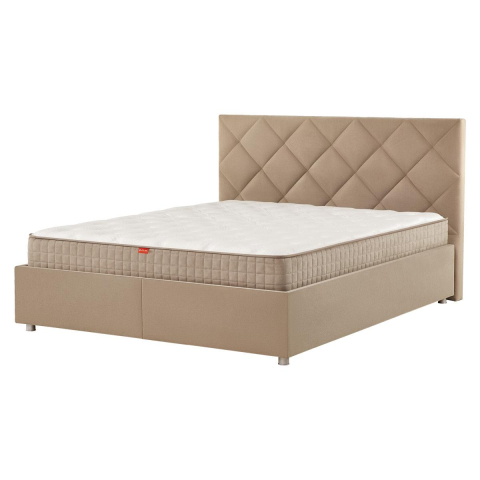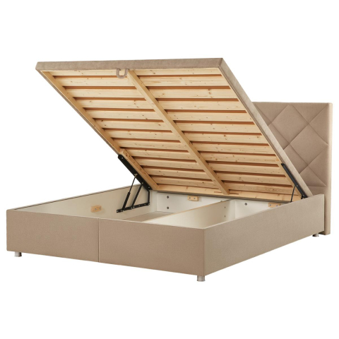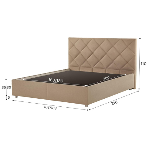 мягкая кровать оснащена фронтальным подъемным механизмом с коробом для белья и мягким стеганым изголовьем |