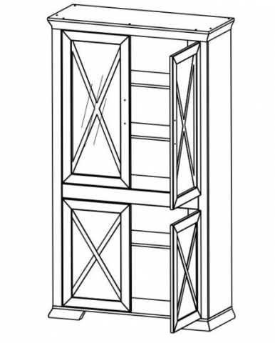 витрина содержит два закрытых отделения: за двумя верхними дверями со стеклянными вставками расположены две полки, в нижнем отделении установлена одна полка |