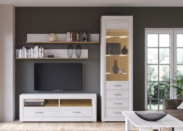 Модульная стенка Маркус ВМК (БРВ) - идеальная коллекция от украинской мебельной фабрики БРВ Украина, для обустройства интерьера гостиной. Корпус изготавливается из качественного ламинированного ДСП, фасад изготавливается из качественного ламинированного ДСП с декоративными планками по периметру из МДФ, в эффектном цветовом сочетании: светлого оттенка "джанни" с удивительным рисунком удачно контрастирует с темными вставками "дуб каменный". Характерными особенностями коллекции является идеальное сочетание функциональности, простых форм и оригинального сочетания цветов; массивный корпус, который смягчают декоративные планки, установленные по периметру всех элементов; продолговатые металлические ручки, которые дополняют общую стилистику; а фирменные комплектующие: петли и телескопические направляющие, гарантируют надежность и долговечность изделиям. Стенка состоит из: стильной витрины с фасадом из закаленного стекла, которая комплектуются светодиодной подсветкой, и подчеркивает древесную структуру и создает неповторимую атмосферу, ТВ-тумбы и изысканных навесных полок. Мебель Маркус БРВ - это предложение для всех, кто ищет функциональные и практичные решения для обустройства своего неповторимого интерьера на основе последних тенденций дизайна. Купить модульную мебель Маркус ВМК (БРВ) можно в нашем интернет-магазине ProMebli.ua с доставкой по всей Украине. Оплата за наличный и безналичный расчет, в кредит, рассрочку или оплату частями от ПриватБанк.