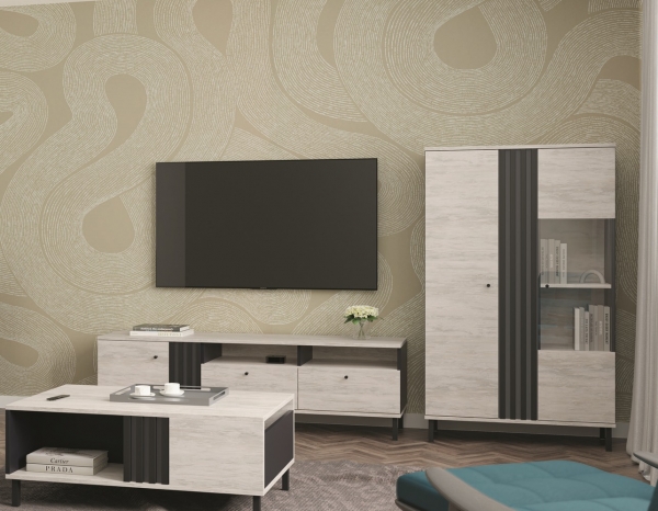 Мини стенка Тео Світ Меблів - неповторимо стильный набор мебели с современными тенденциями дизайна от украинского производителя Світ Меблів, для обустройства уникальной обстановки в гостиной. Корпус и фасадные части изготавливаются из качественного ламинированного ДСП толщиной 16 мм в великолепном сочетании светлой древесной текстуры "артвуд светлый" с темными антрацитовыми вставками. Мебельный гарнитур привлекает внимание уникальным стилем; совершенством в просте; минимальным декоративным оформлением; восхитительным сочетанием с контрастами; нестандартными декоративными рельефными вставками; интересными миниатюрными точечными ручками, черного цвета; выразительными высокими ножками; фирменными комплектующими: петлями и направляющими полного выдвижения, которые обеспечивают максимальный комфорт в использовании. Мини стенка включает: экстравагантную ТВ тумбу и оригинальную витрину со вставками из прозрачного закаленного стекла. Уникальная мебель Тео артвуд светлый Світ Меблів - это гармоничное сочетание неповторимого вкуса стиля и безупречного качества исполнения. Купить мебель Тео артвуд светлый Світ Меблів можно в нашем интернет-магазине ProMebli.ua с доставкой по всей Украине. Оплата за наличный и безналичный расчет, в кредит и рассрочку.