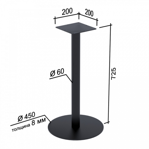Опора BS-450 от производителя Loft Design (Украина) классическая модель обеденного стола с одной ножкой. Она подходит для круглых, квадратных, прямоугольных и овальных столешниц. Опора BS-450 состоит из основания, изготовленного из металлического листа толщиной 8 мм, металлической трубы диаметром 60 мм и основания под столешницу толщиной 4 мм. Столешница крепится с помощью саморезов (не входят в комплект). Покрытие металла - полимерная порошковая износоустойчивая краска. Под основанием имеются резиновые подкладки для предотвращения повреждения напольных покрытий. Высота опоры 725 мм - это стандартная высота для обеденных столов. Столешница приобретается отдельно.