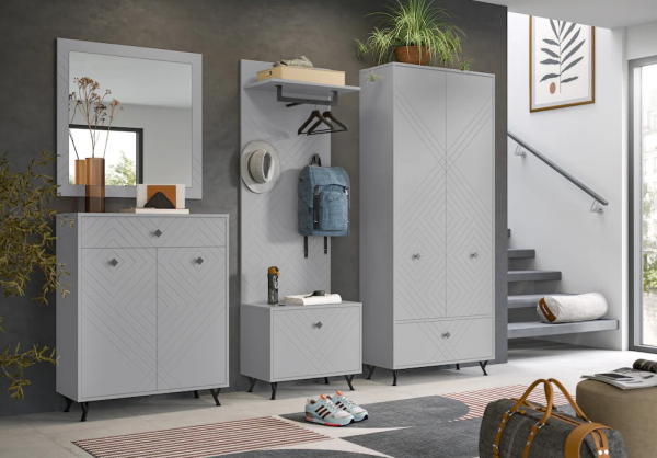 Прихожая Камео шиншилла серая Сокме - настоящий шедевр утонченного стиля и элегантности, образец инновационной и эксклюзивной мебели, идеально подходящей для создания спокойной и изысканной атмосферы в прихожей. Корпус изготавливается из качественного ламинированного ДСП толщиной 16 мм, фасады из ламинированного МДФ толщиной 16 мм, в изысканных оттенках шиншилла серая / агат софт тач, с легким матовым покрытием soft touch, которое придает поверхности приятную бархатистость и подчеркивает премиальный характер мебели. Все торцевые поверхности элементов аккуратно облицованы ПВХ-кромкой толщиной 0,6 мм, что придает мебели эстетичную завершенность и аккуратный внешний вид. Коллекция восхищает своим уникальным дизайном: геометрическим фрезерованным рисунком фасадов, создающим эффект глубины и тактильной выразительности; приглушенно-серым тоном шиншилла серая, наполняющим пространство спокойствием и благородством; темными металлическими ручками-кнопками, добавляющими индустриальный шарм и подчеркивающими современный характер мебели; темными металлическими Y-образными ножками, придающими композиции визуальную легкость, сохраняя при этом надежность и устойчивость конструкции, фирменной фурнитурой телескопические направляющие и петли Hafele, обеспечивая плавное и бесшумное открывание, делая использование мебели максимально комфортным. Прихожая состоит из продуманных элементов: комода для хранения аксессуаров и повседневных мелочей; вместительного шкафа для одежды, поддерживающего порядок в гардеробе; вешалки с крючками и полкой для удобного размещения верхней одежды и головных уборов; тумбы для обуви, помогающей поддерживать аккуратность в прихожей; а также зеркала, которое визуально расширит пространство и завершит композицию легким отражающим акцентом. Все элементы коллекции выдержаны в едином дизайнерском стиле и могут быть легко скомбинированы в зависимости от ваших предпочтений и особенностей помещения. Камео шиншилла серая Сокме - настоящее произведение искусства, создающее пространство, где каждая деталь вдохновляет, а комфорт превращается в эстетическое удовольствие. Купить мебель в прихожую Камео шиншилла серая Сокме можно в нашем интернет-магазине ProMebli.ua с доставкой по всей Украине. Оплата за наличный и безналичный расчет, в кредит и рассрочку.