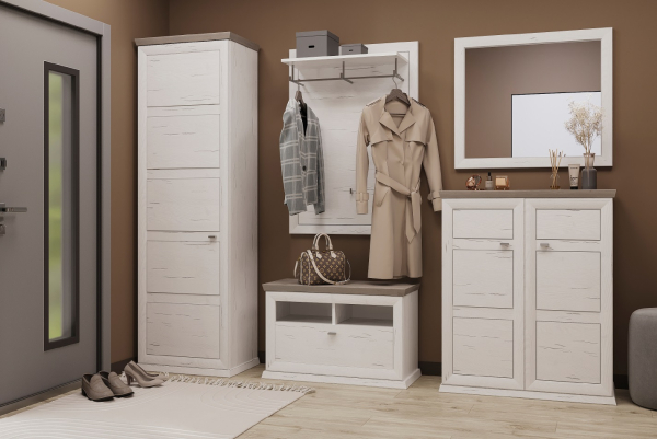 Комплект мебели в прихожую Орегон Сокме - элегантный набор мебели в скандинавском стиле от украинской фабрики Сокме, который никогда не выйдет из моды и всегда остается на пике популярности, прекрасно подойдет для обустройства интерьера прихожей. Корпус изготавливается из качественного ДСП толщиной 16 мм и 22 мм, фасады - из ДСП с накладками из МДФ толщиной 25 мм, в комбинации цветов светлого - пино аурелио с более темным - мадагаскар нельсон. Торцевые поверхности всех внутренних и наружных элементов изделий облицованы кромкой ABS толщиной 0,5/1 мм, придавая мебели завершенный красивый и ухоженный вид. Коллекция привлекает внимание элегантностью и лаконичностью; эргономичностью и универсальностью; нежной приятной текстурой дерева; оригинальными металлическими ручками, серебристого цвета; прочным основанием, способствующим максимальной устойчивости; фирменными комплектующими: направляющими скрытого монтажа с доводчиками Hettich и петлями c доводчиками GTV Hettich, которые обеспечивают максимальный комфорт в использовании. Роскошный набор объединяет в себе разнообразные элементы удобные тумбы, вместительный шкаф и прекрасную навесную вешалку. Все элементы с модульной системы гармонично сочетаются друг с другом, поэтому, комбинируя различные элементы серии Вы сможете создать уникальные мебельные композиции. Мебель Орегон Сокме поможет создать уютный и функциональный интерьер, подчеркнув Вашу индивидуальность. Купить мебель в прихожую Орегон Сокме можно в нашем интернет-магазине ProMebli.ua с доставкой по всей Украине. Оплата за наличный и безналичный расчет, в кредит и рассрочку.