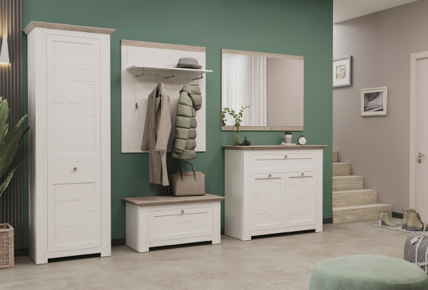Прихожая Версаль Сокме наполнит ваш дом уютом, создаст особую атмосферу и станет утонченной изюминкой прихожей. Корпус мебели выполнен из прочного ламинированного ДСП толщиной 16 и 18 мм, фасады из ламинированного ДСП с декоративными рамками из МДФ толщиной 16 мм, представленные в роскошном сочетании оттенков сосна арктическая / мадагаскар нельсон. Торцевые поверхности аккуратно облицованы кромкой ABS толщиной 0,5 мм, благодаря чему мебель выглядит завершенной, ухоженной и гармоничной. Коллекция привлекает внимание своим изысканным дизайном, простотой и элегантностью форм, эффектным контрастом темных столешниц и светлых фасадов, стильными миниатюрными ручками и надежной фурнитурой: телескопическими направляющими скрытого монтажа и петлями Hafele, которые дарят максимум удобства в повседневном использовании. В наборе собраны модули для создания полноценного и уютного интерьера: шкаф, тумба для обуви, вешалка для одежды и элегантное настенное зеркало. Все элементы легко комбинируются, позволяя создавать индивидуальные композиции и подчеркивать стиль вашего дома. Версаль Сокме воплощение элегантности, утонченности и домашнего тепла. Купить мебель Версаль Сокме можно в нашем интернет-магазине ProMebli.ua с доставкой по всей Украине. Оплата за наличный и безналичный расчет, в кредит и рассрочку.