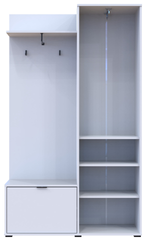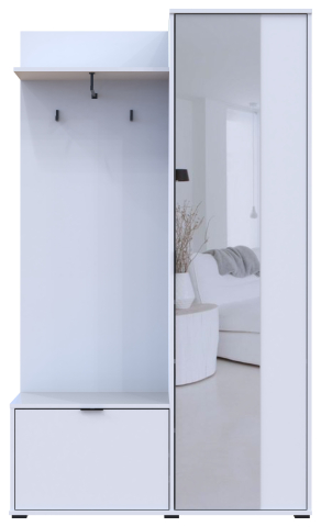 прихожая представлена цельной конструкцией, состоит из: шкафа с выдвижной штангой для вешалок, тумбы для обуви и вешалка с крючками и полкой для головных уборов |