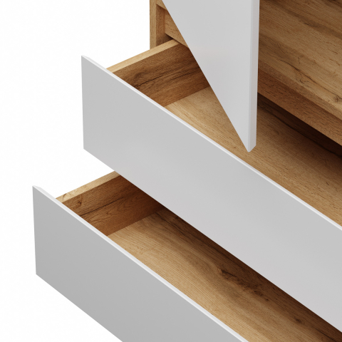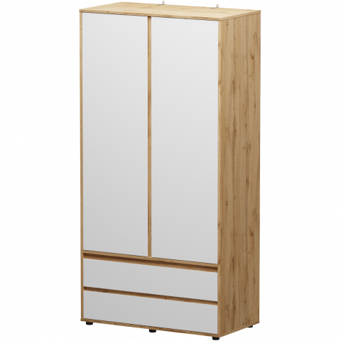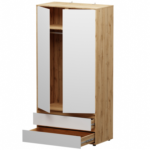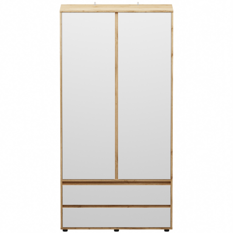 Шкаф 2Д2Ш Нитро Софт Сокме - современный предмет мебели, идеально подходящий для хранения вещей в спальни, гостиной, детской и прихожей. Шкаф содержит два выдвижных ящика и одно закрытое отделение со штангой для вешалок внутри. Коллекция выгодно выделяется: стильным современным дизайном; правильными геометрическими формами; гармонией светлых фасадов и натуральной древесной текстуры; отсутствием ручек, их роль выполняют фрезерованные на фасаде выемки под углом 45°; небольшими устойчивыми ножками; а также качественной фурнитурой. Мебель Нитро Софт белая Сокме - функциональное решение для современных интерьеров, которое сочетает эстетику и удобство, создавая уютное и практичное пространство.