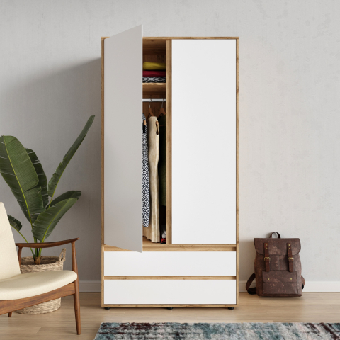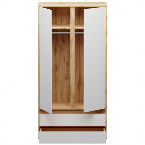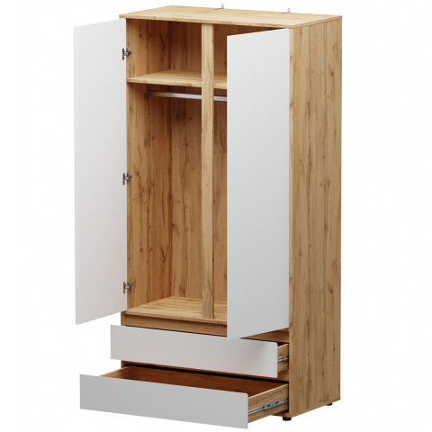 шкаф содержит два выдвижных ящика и одно закрытое отделение со штангой для вешалок внутри |