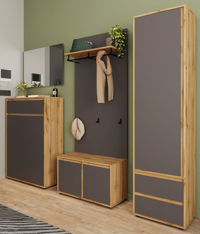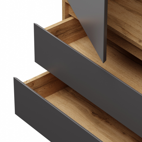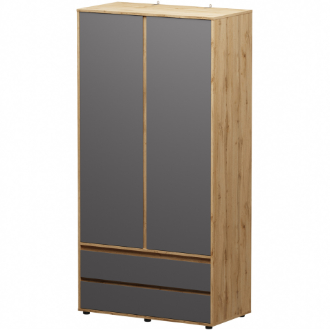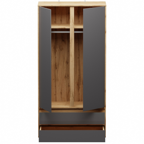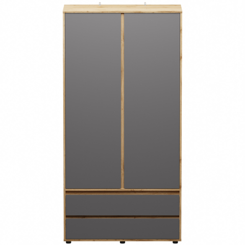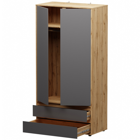 Шкаф 2Д2Ш Нитро Софт Сокме - современный предмет мебели, идеально подходящий для хранения вещей в спальни, гостиной, детской и прихожей. Шкаф содержит два выдвижных ящика и одно закрытое отделение со штангой для вешалок внутри. Коллекция выгодно выделяется: стильным современным дизайном; правильными геометрическими формами; гармонией темных фасадов и натуральной древесной текстуры; отсутствием ручек, их роль выполняют фрезерованные на фасаде выемки под углом 45°; небольшими устойчивыми ножками; а также качественной фурнитурой. Мебель Нитро Софт графит Сокме - функциональное решение для современных интерьеров, которое сочетает эстетику и удобство, создавая уютное и практичное пространство.